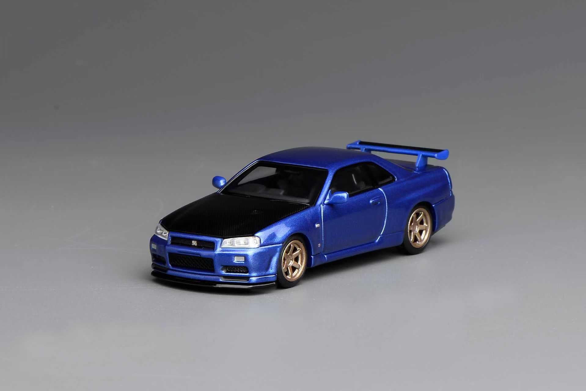 (PRE-ORDER) Motorhelix 1:64 NISSAN SKYLINE GT-R (R34) V-SPEC II CUSTOMIZED BAYSIDE BLUE W/ CARBON FIBER BONNET M63451